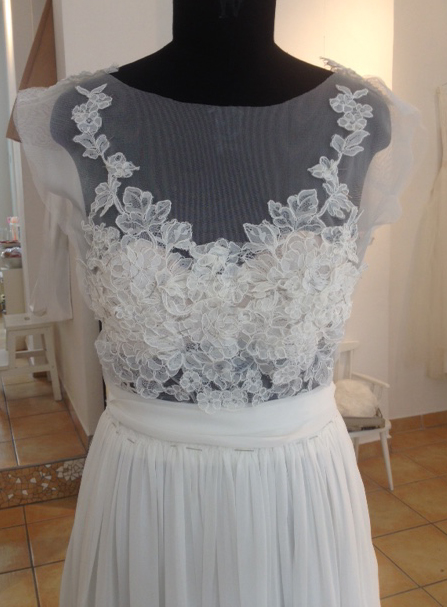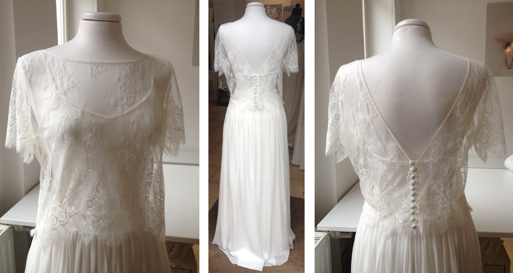 Hier seht Ihr wieder einmal ein ganz individuelles Brautoutfit, das ich für eine supernette Braut anfertigen durfte. Es besteht aus drei Teilen und ist somit auch nach der Hochzeit sehr gut kombinier- und tragbar. – Und ich liebe diese Spitze!!