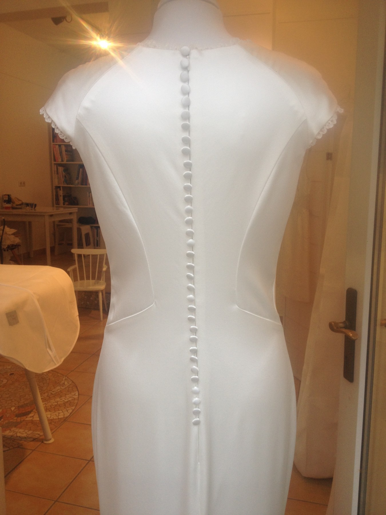 Kleine Details machen den feinen Unterschied. Die Knöpfe für solch eine sexy Rückenansicht werden in meinem Atelier einzeln von Hand mit Stoff bezogen und angenäht. Da steckt viel Liebe drin.