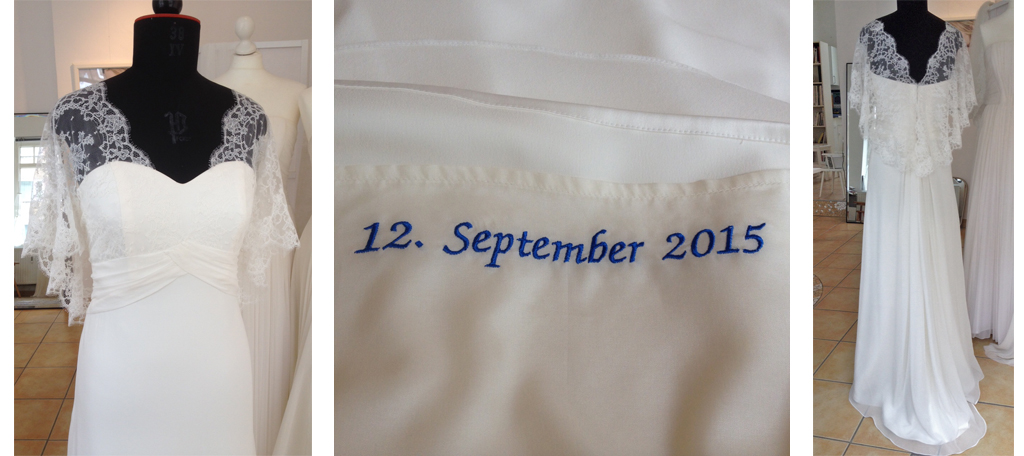 machen Euer Kleid unverwechselbar. Bei diesem feinen Modell hatte sich die supersympathische Braut einen eingestickten Datumsschriftzug im Futter des Kleides gewünscht. Diesen Wunsch habe ich gern erfüllt – und bin schon sehr gespannt auf die Hochzeitsfotos mit den blauen Highheels!