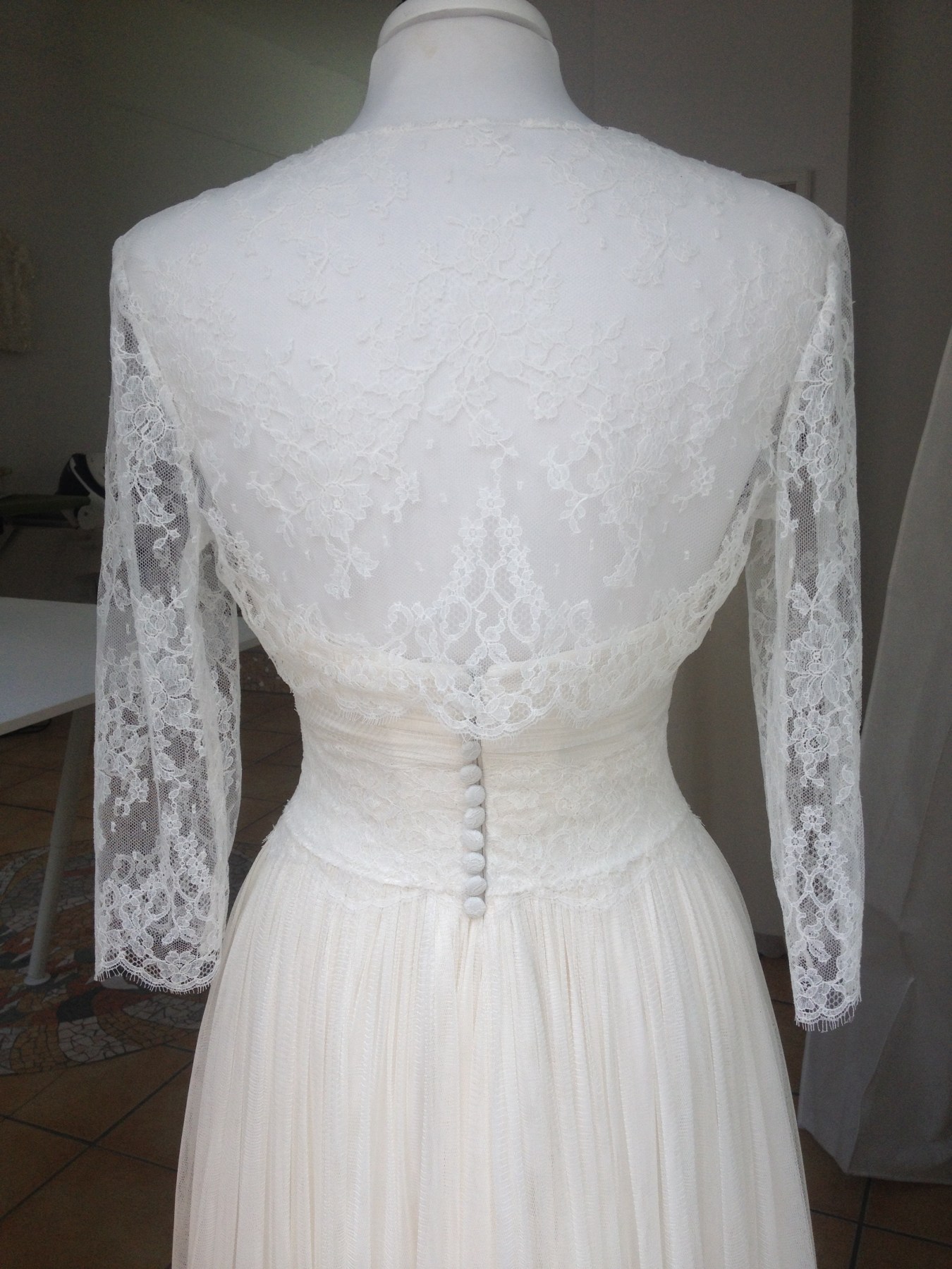 Hier kommt zwischendurch mal wieder ein schneller Entwurf an der Schneiderpuppe. Und, wo sind die mutigen Bräute, denen die neue Silhouette (und die wunderbare Tüllspitze!) gefällt?