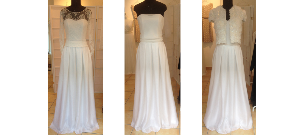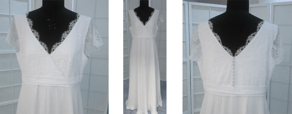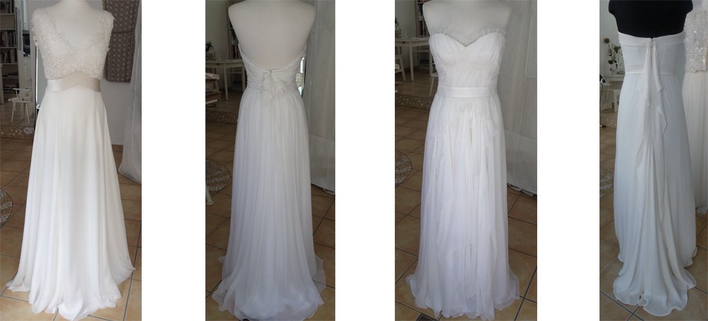 Kurz bevor sie für ihren Einsatz am „schönsten Tag im Leben“ abgeholt wurden, habe ich diese Kleider noch schnell fotografiert. Für die wunderbaren Faltenwürfe sorgen feinster Chiffon und Seidengeorgette – das finde ich immer wieder schön!