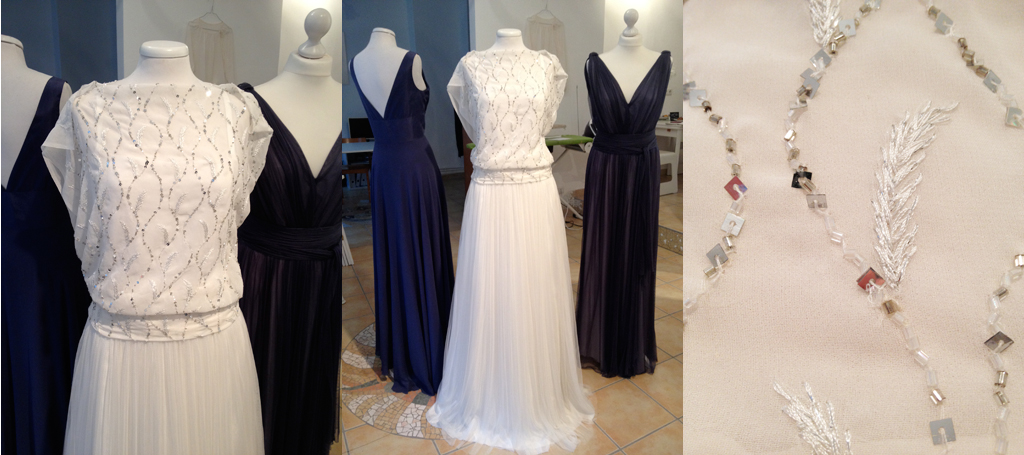 Hier entwickle ich gerade ein neues Modell an der Puppe. Ich mag, dass es lässig und festlich zugleich ist. Toll ist auch, dass man den Tüllrock und das Chiffonoberteil jeweils auch ganz anders kombinieren kann. Auch ein Einfärben nach der Feier ist bei vielen Stoffen möglich. Viel Spaß beim Kombinieren!